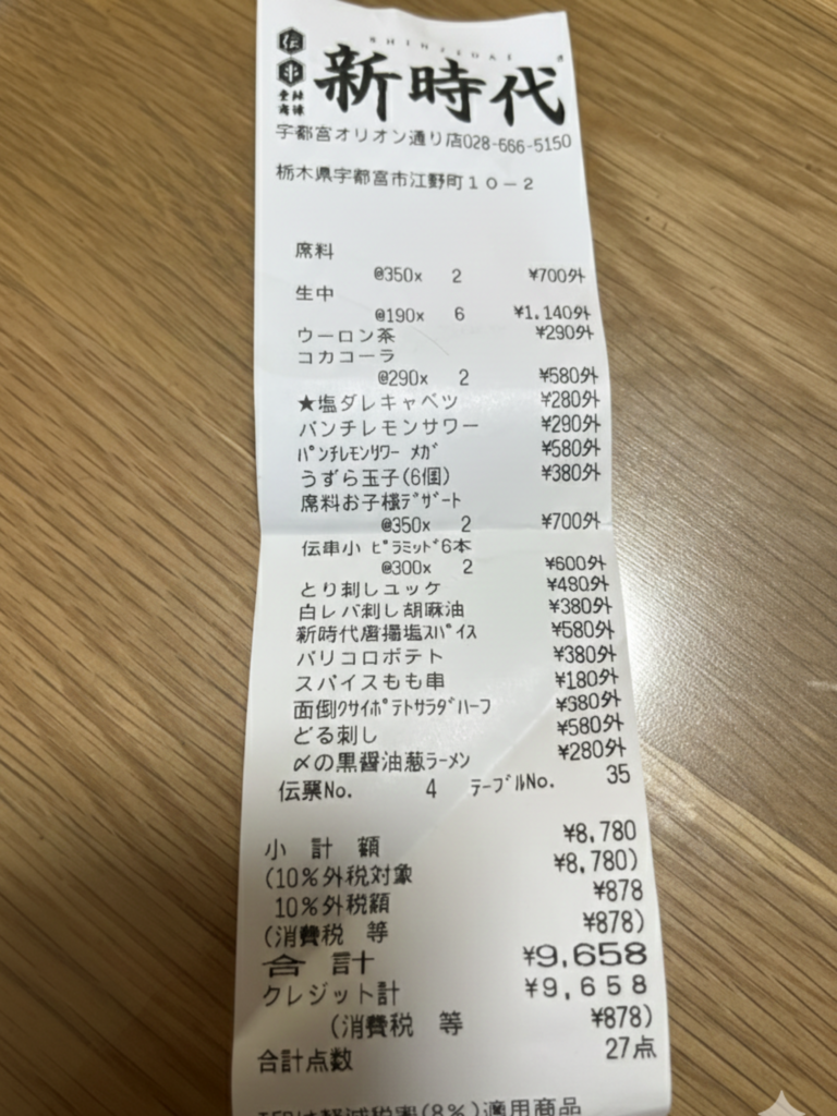 今回の合計金額は、税込9,658円でした! 大人2人が生ビールを6杯、さらにメガサワーまで飲んで、子供たちもデザートまで完食してこのお値段。